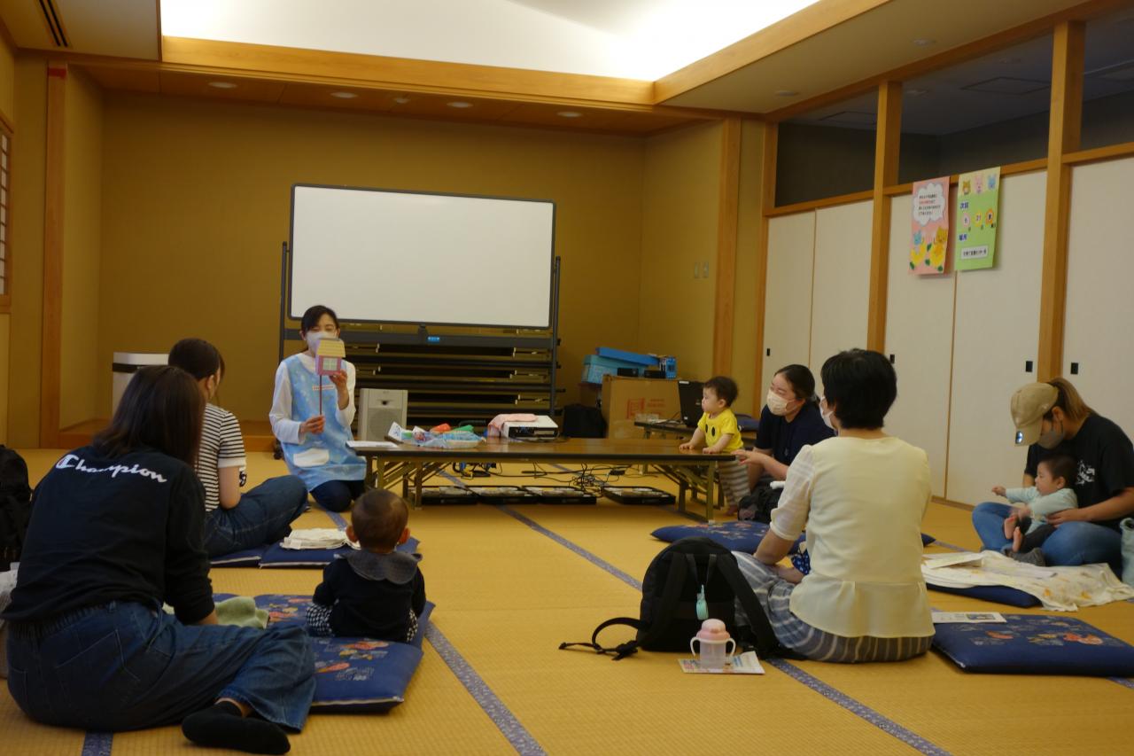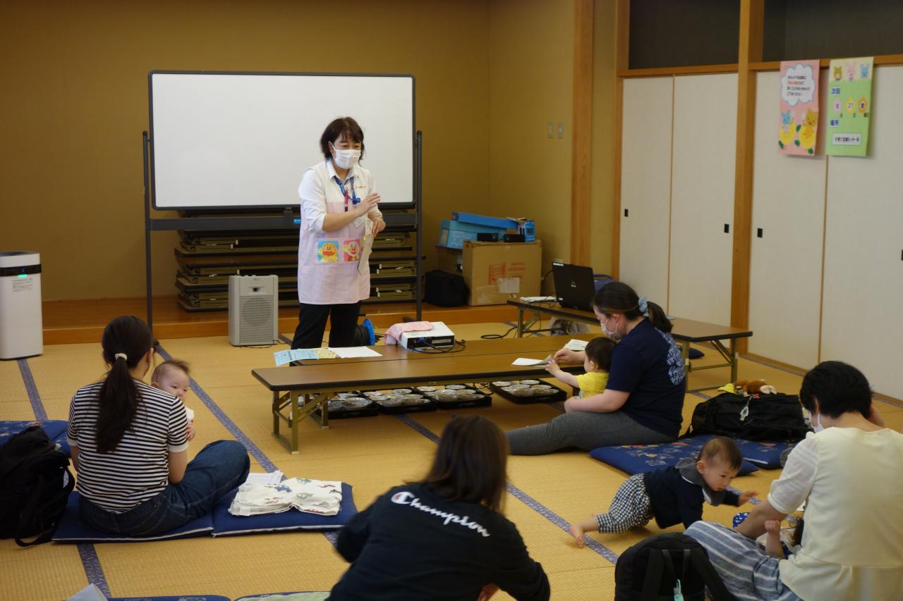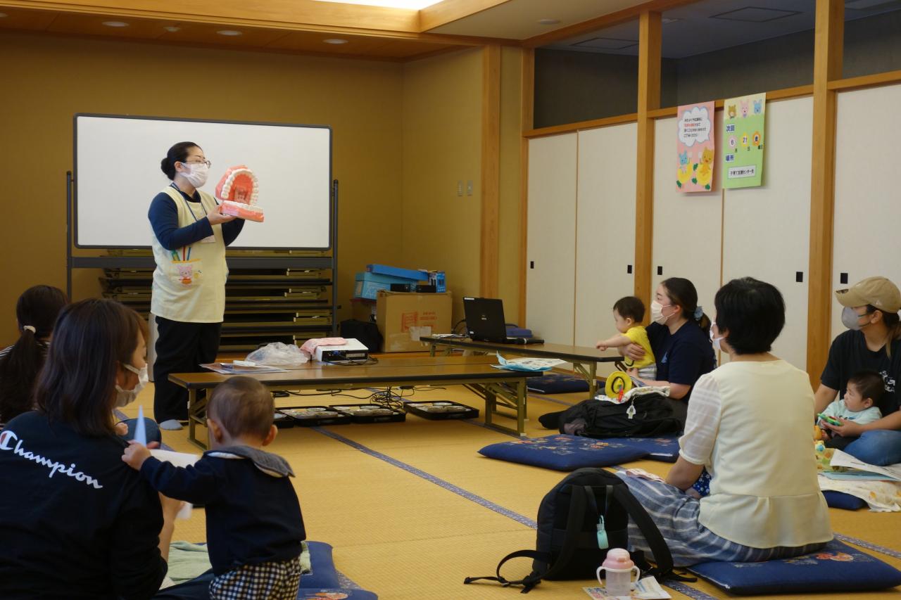 今回のさくらんぼクラブは健康づくりセンタープラムの職員の歯科衛生士と管理栄養士による、乳歯のお手入れ方法とらくらく離乳食についてのお話をしました。
