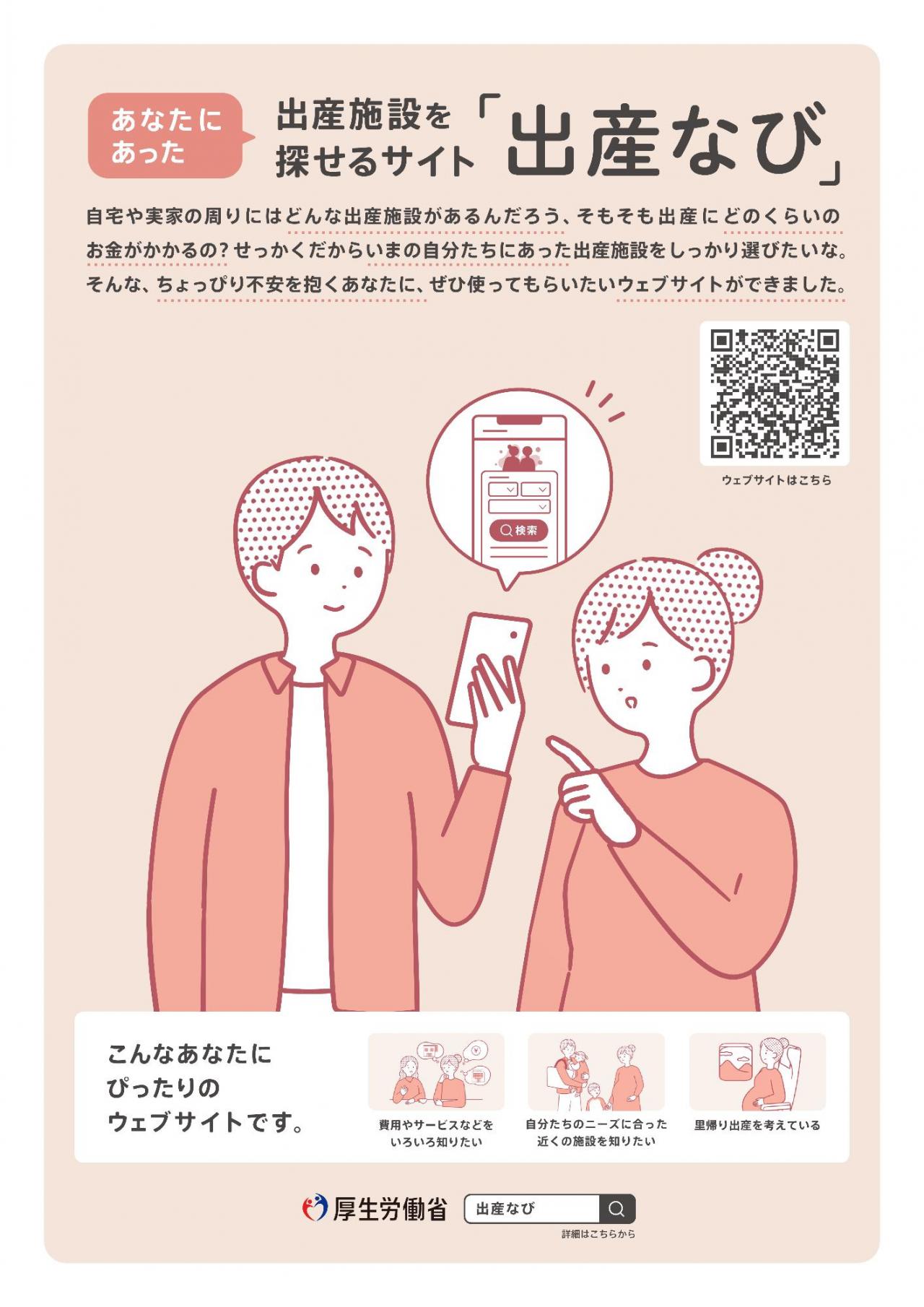 『出産なび』は、厚生労働省が全国の分娩を取り扱う施設(病院・診療所・助産院)の特色・サービスや費用についての情報提供を行うウェブサイトです。